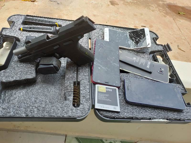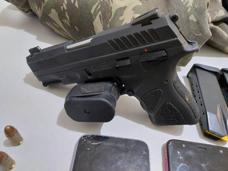 De posse do endereço a equipe policial com apoio de demais viaturas rapidamente foi ao local indicado e realizou o cerco a residência, porém, os suspeitos ao perceberem a presença das viaturas saíram sem desabalada carreira adentrando ao quintal da casa, onde um dos indivíduos que usava uma camiseta vermelha jogou um objeto no quintal da residência vizinha, que posteriormente foi encontrado pela equipe onde foi verificado que se tratava de uma pistola de marca Taurus, Cal 9mm, com numeração raspada.