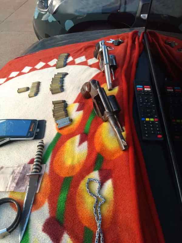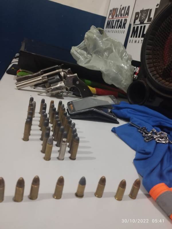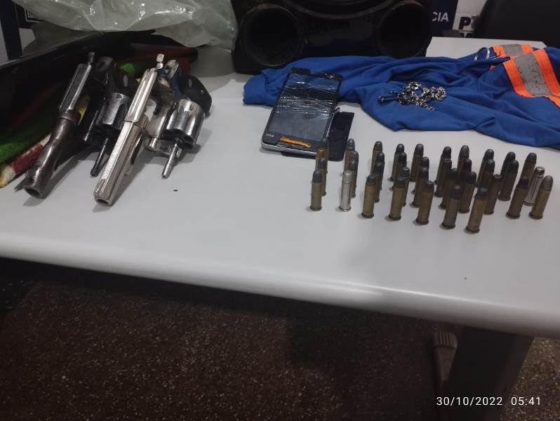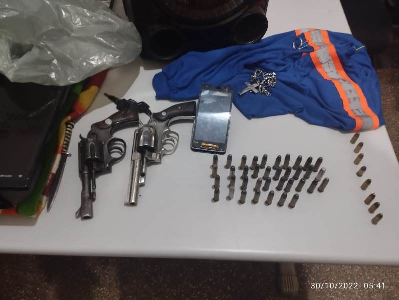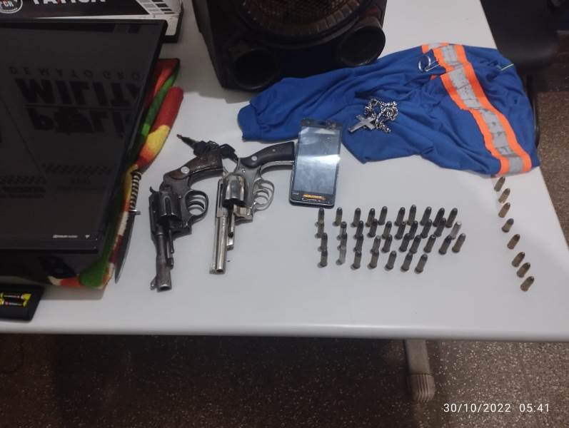 Durante buscas no interior da residência foi localizada duas armas de fogo sendo um revólver Cal 357 municiado com seis munições embaixo do colchão, já no meio de algumas roupas, próximas ao colchão foi encontrado um revólver Cal 38 com seis munições e uma sacola contendo munições de Cal 38 e 9mm.