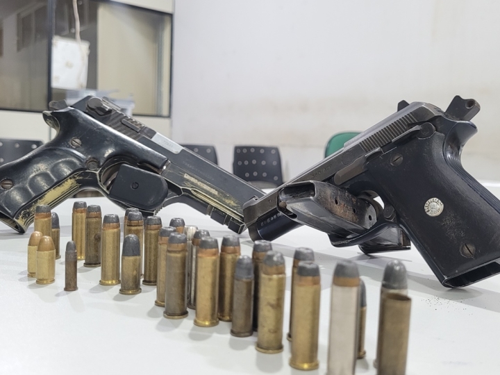 Diante das informações que no local estaria os autores do homicídio e tentativa, ocorridos na noite de ontem (sábado), no Bairro Espírito Santo, os policias intensificaram as buscas no quintal da casa e foram localizadas em um buraco, tampado com folhas secas, duas pistolas, sendo uma de Cal .40 e outra de Cal .380, além de várias munições, o que em tese, corrobora com a denúncia.