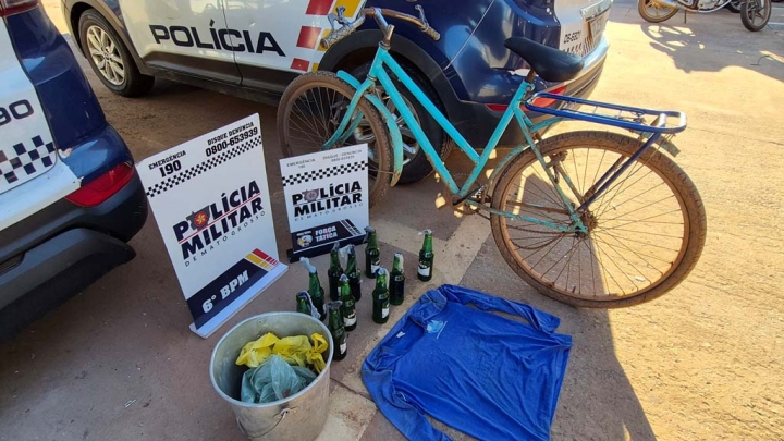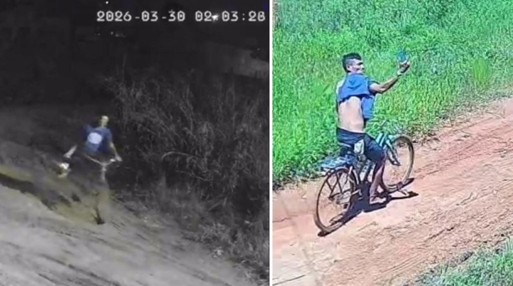 Ao verificar as imagens das câmeras de segurança da residência, a moradora visualizou um indivíduo vestindo camisa azul, bermuda preta e chinelos, que estava em uma bicicleta e carregava um balde nas mãos.