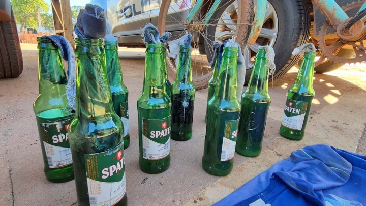 Durante varredura na lateral do imóvel, os policiais perceberam um forte odor de gasolina. Foi constatado que o suspeito havia arremessado contra o muro da residência um artefato incendiário, possivelmente um coquetel molotov. No entanto, o material não se propagou a ponto de causar incêndio, resultando apenas em uma grande mancha escura provocada pela combustão.