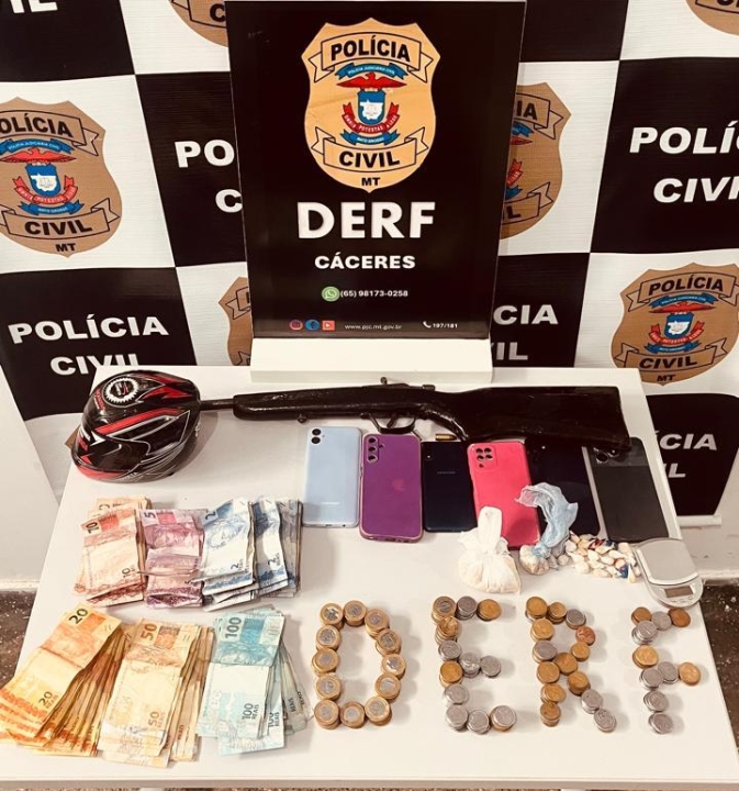 Durante a busca, os investigadores localizaram no quarto do casal diversas cédulas de dinheiro trocado em cima da cama, uma espingarda ao lado do guarda-roupas, uma bacia vermelha com resquícios de pasta-base de cocaína, faca, tesoura, colheres, invólucros utilizados no preparo da droga, uma balança de precisão e seis aparelhos celulares.