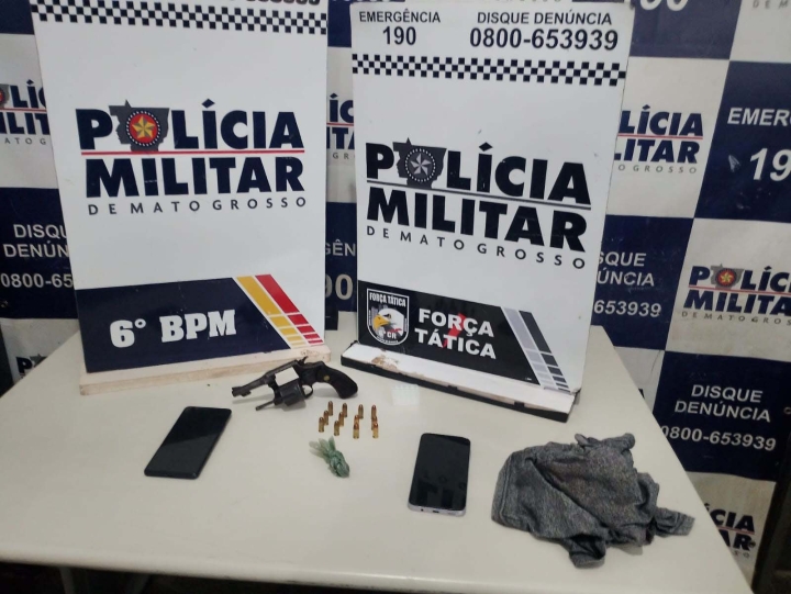 Diante da denúncia, a equipe acionou a Força Tática que se posicionou aos fundos da residência com objetivo de observar alguma tentativa dos suspeitos dispensar algo ilícito, enquanto que outra guarnição bateu no portão da frente se identificando como policial, sendo que, nesse momento um dos suspeitos, posteriormente identificado como sendo um jovem de 18 anos, morador da cidade de Rondonópolis, que arremessou por cima do muro uma arma de fogo enrolada em uma camiseta e, em seguida, saiu da casa acompanhado de duas mulheres para atender a equipe policial.