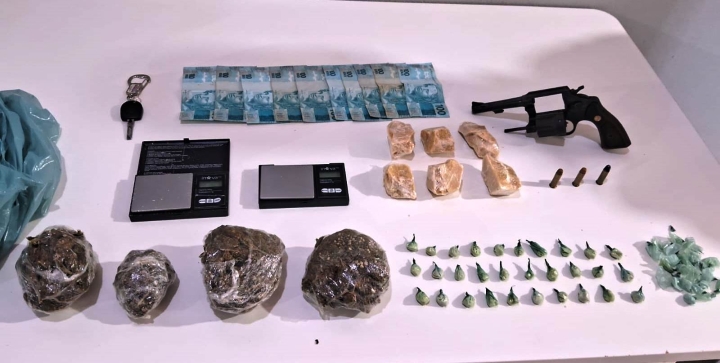 Algum tempo depois o suspeito resolveu levar a guarnição policial até a residência onde havia escondido a arma de fogo usada no crime e que, lá havia uma quantidade de entorpecentes, bem como, a chave do veículo da vítima, e quando chegaram a residência não havia ninguém e durante as buscas foi localizado o revólver Cal 38, contendo somente as três munições intactas dentro de uma garrafa térmica de cor branca, escondida no sofá, com vários invólucros de entorpecentes e no interior de um dos quartos estava a chave do veículo da vítima.