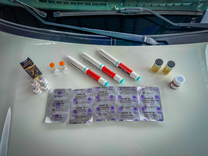 Foram apreendidos 60 frascos de TG, 47 frascos de Lipoless, 4 frascos de Gluconex, 2 frascos de Testenat Depot, 1 frasco de Drostanolona Propionato, 3 canetas de Retratutide, 1 frasco de Cabertrix e 5 cartelas de Lispax.