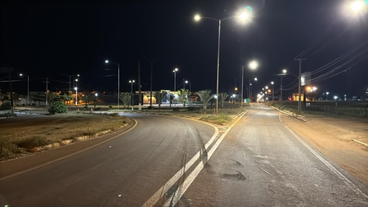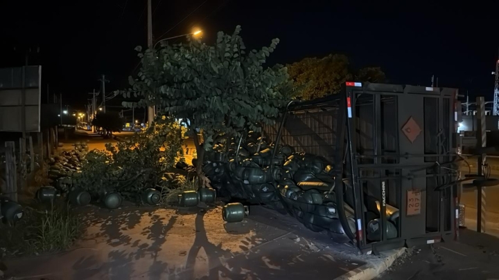 Um caminhão carregado com botijões de gás de cozinha tombou na rotatória da BR-174 B, em frente à pista de kart, em Pontes e Lacerda (MT), na noite de ontem, quinta-feira (22).