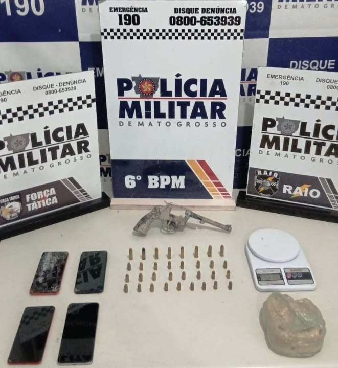 Considerando a situação de flagrante delito, as equipes entraram no imóvel e realizaram varredura. Durante as buscas, foi localizado um revólver calibre .38 com sete munições intactas, escondido dentro de um cano no interior da residência. Também foram apreendidas duas munições sobressalentes do mesmo calibre, 25 munições calibre .380 encontradas em uma sacola na parte frontal do quintal, meio tablete de substância análoga à pasta base de cocaína escondido sob um tanque, uma balança de precisão e quatro aparelhos celulares.