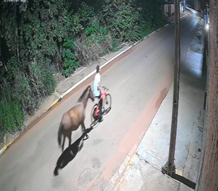 O crime foi registrado por câmeras de segurança nas proximidades onde aparece o malandro em uma bicicleta, arrebenta a cerca, entra no pasto e, em seguida, sai tranquilamente puxando o seu cavalo.